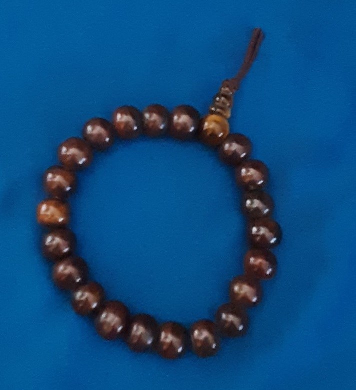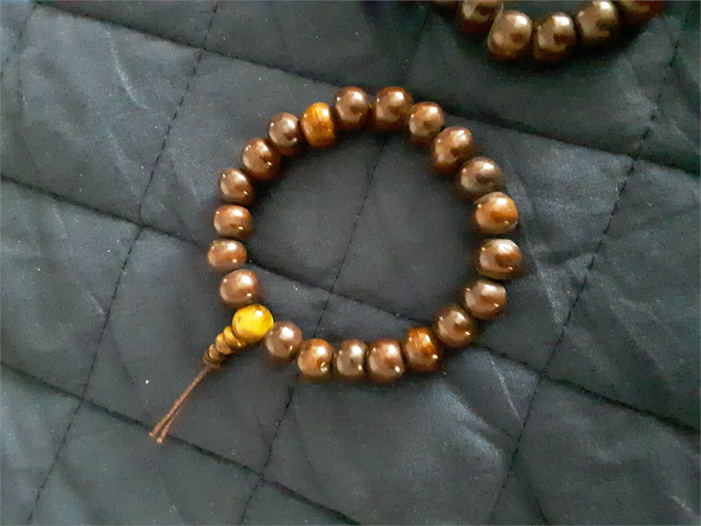 This bracelet is a wrist mala made with 21 vintage bone beads (made in Nepal in the 1970s) strung on high quality clear stretch cord, and finished with a gemstone guru bead made of tiger's eye. It fits a 7 to 7.5 inch wrist. Custom sizes (larger or smaller) can be made at no extra charge if you need a different size. This style of wrist mala is popular with men.