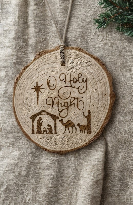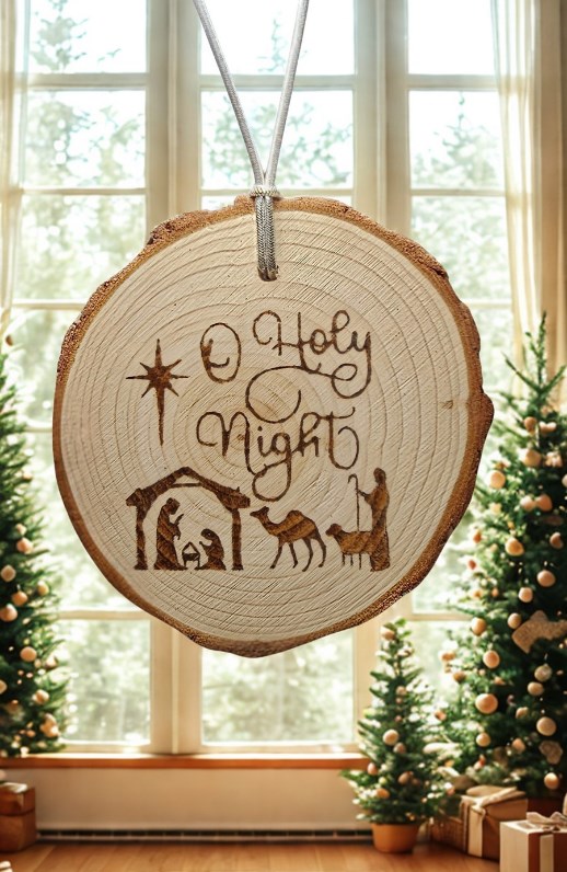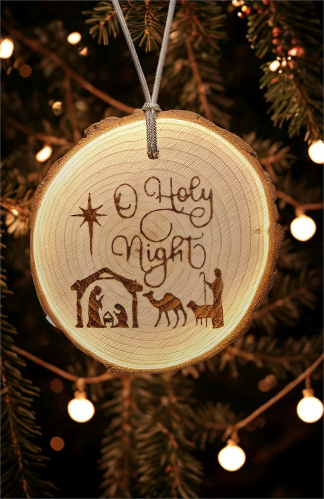 Celebrate the birth of Jesus with a wood slice ornament. Features real fir wood with real bark. Design is burned by hand using wood burning/pyrography technique.