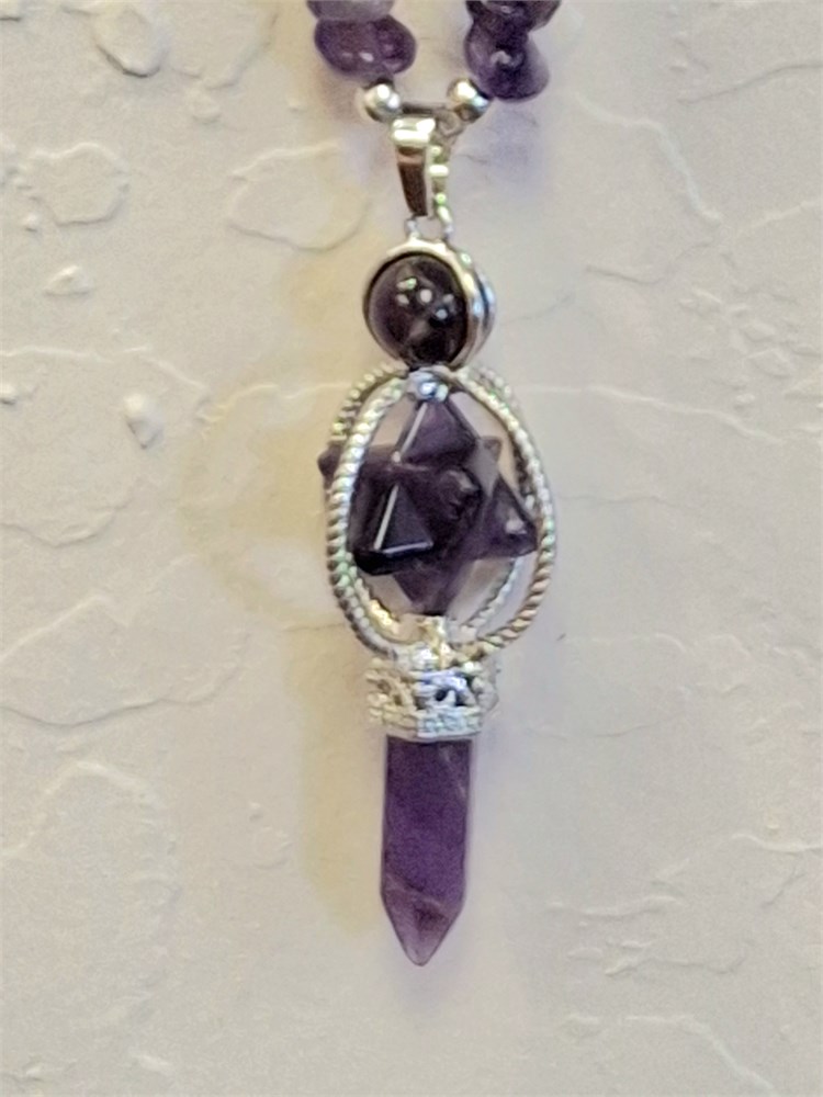 Aprox. 20 in. Hand beaded Amethyst Necklace with Merkaba & Point Amethyst Pendant.